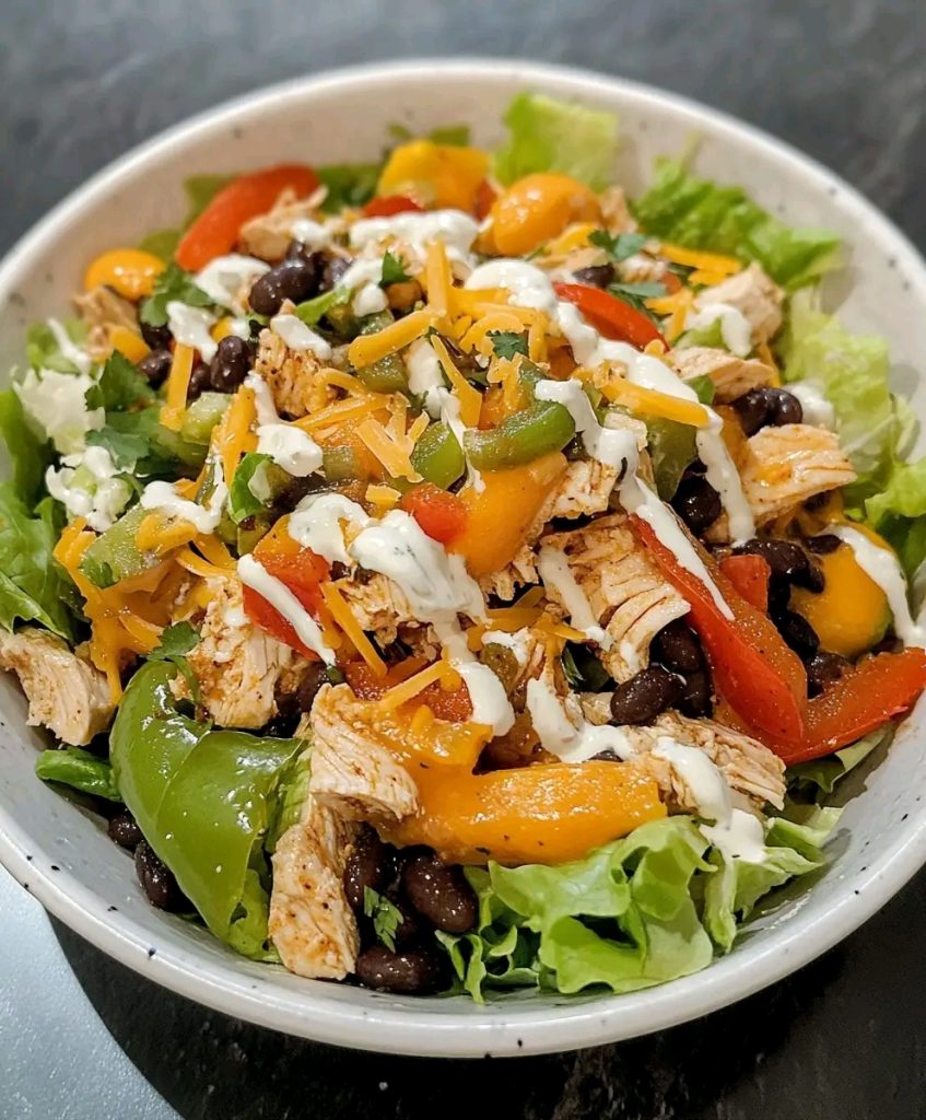 A vibrant, flavor-packed salad loaded with tender seasoned chicken, black beans, peppers, lettuce, cheese, and a creamy drizzleβbasically a deconstructed burrito bowl but lighter and super satisfying! Fresh, zesty, crunchy, and perfect for lunch or dinner.