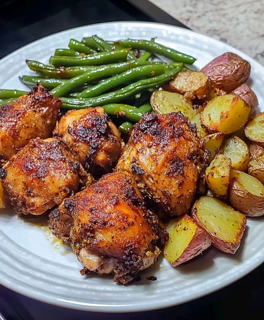 A hearty, comforting, and flavor-packed plate! Crispy chicken thighs seasoned to perfection are paired with golden roasted potatoes and tender, slightly charred green beans. This is the perfect easy weeknight dinner β€” simple ingredients, big flavor, and beautifully balanced.