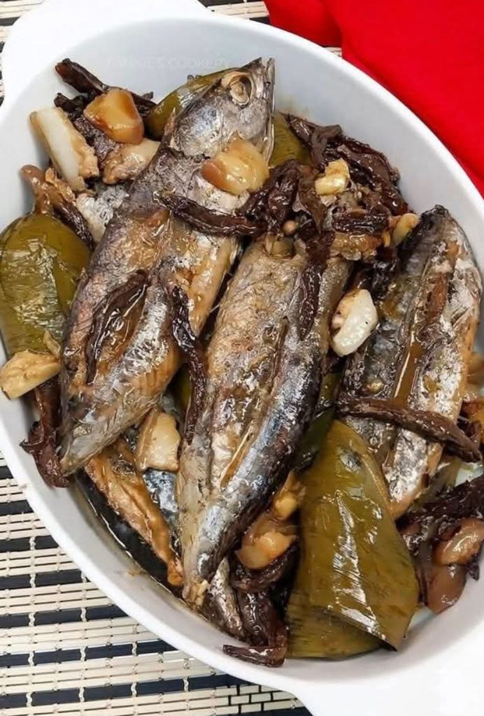 In a saucepan or pan, put half of the garlic, kamias and pork fat. The next step is to stack the fish and top with kamias and garlic again. Season with salt and pepper. Add 4 cups of water. Cover and bring to a boil over medium heat.