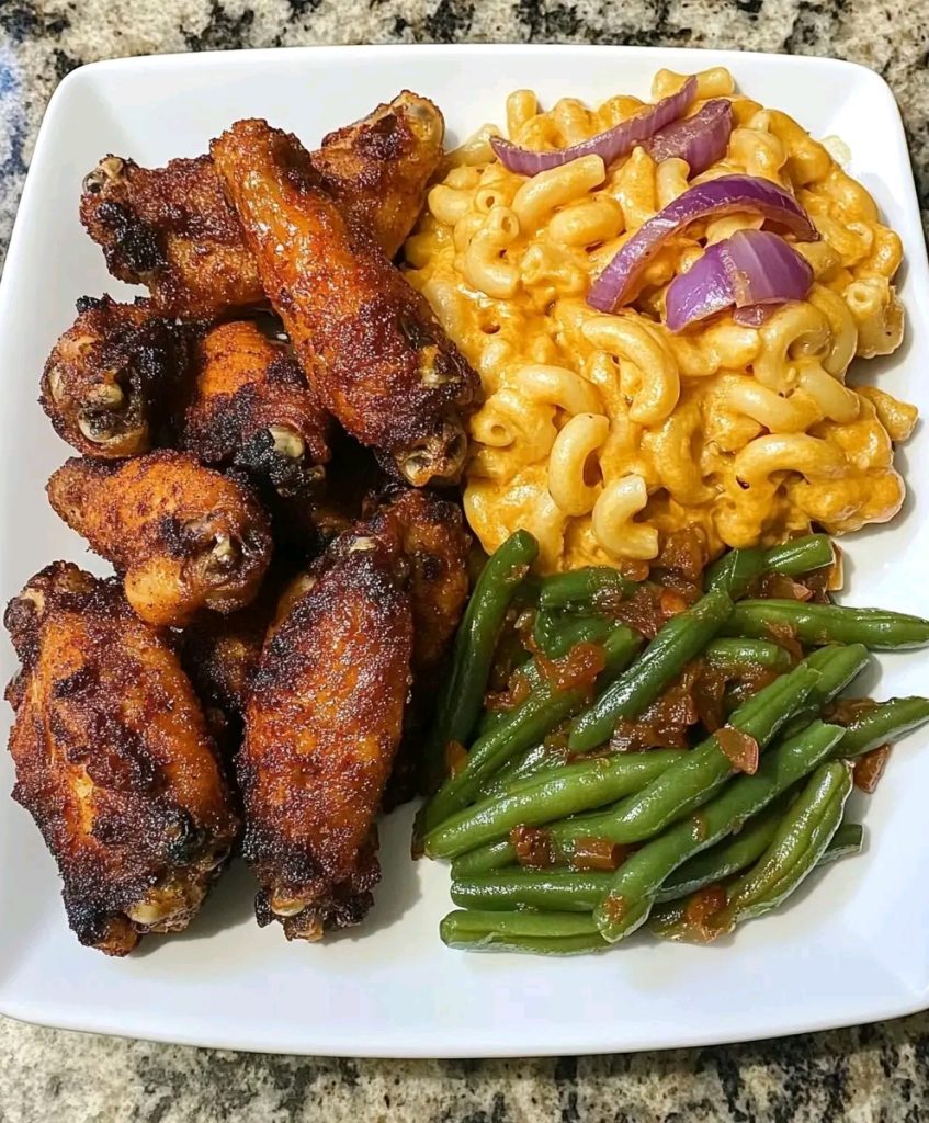 Assemble the Plate: Load up with a generous scoop of baked mac, crispy wings, and a side of those savory green beans. Grab a napkin — you’re gonna need it.