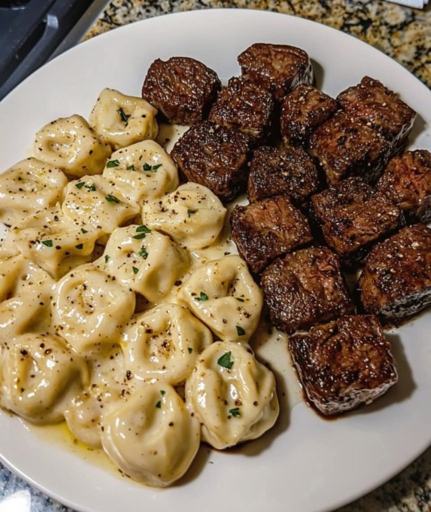 GARLIC BUTTER STEAK BITES & CREAMY ALFREDO TORTELLINI