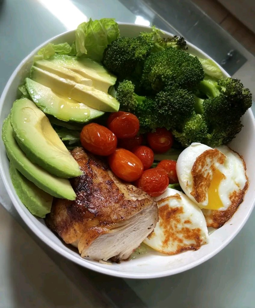Start with romaine at the bottom. Add your chicken to one side, pile on the broccoli and tomatoes, tuck in the avocado slices, and lay that perfect egg white in there like itβs the star of the show.