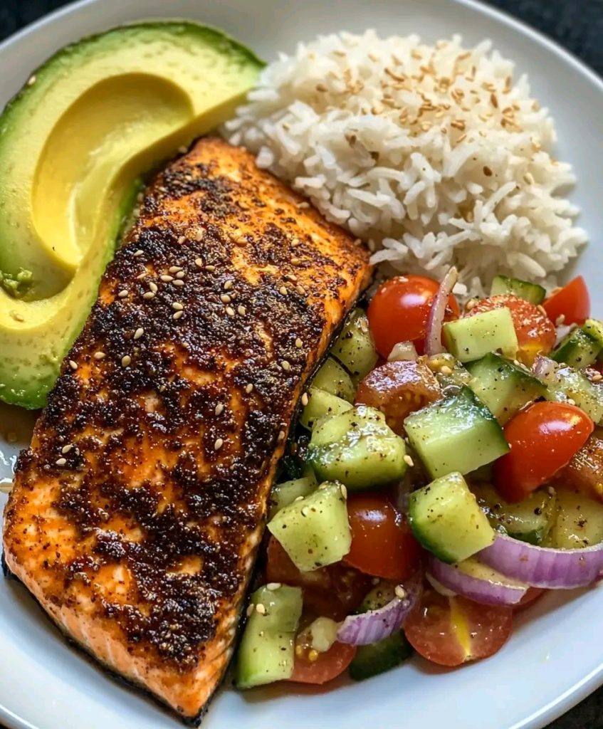 Cajun Salmon with Creamy Avocado–Cucumber Salad & Steamed Rice