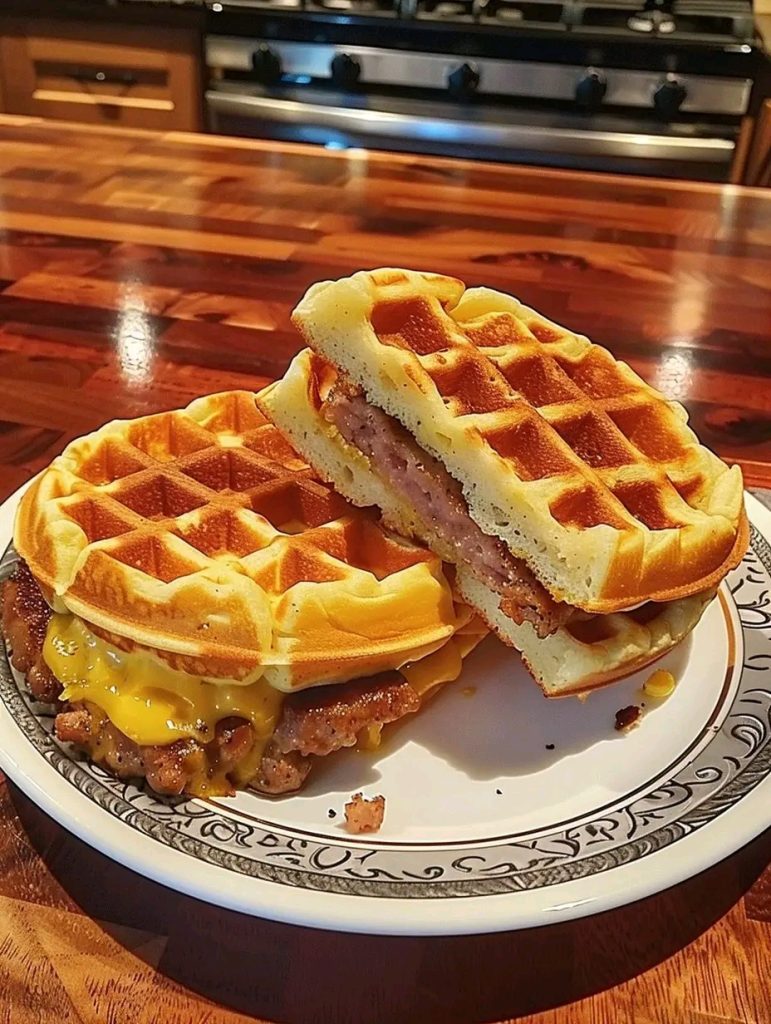 Stack your breakfast sandwich: layer a sausage patty or bacon, an egg, and cheese between two warm chaffles.