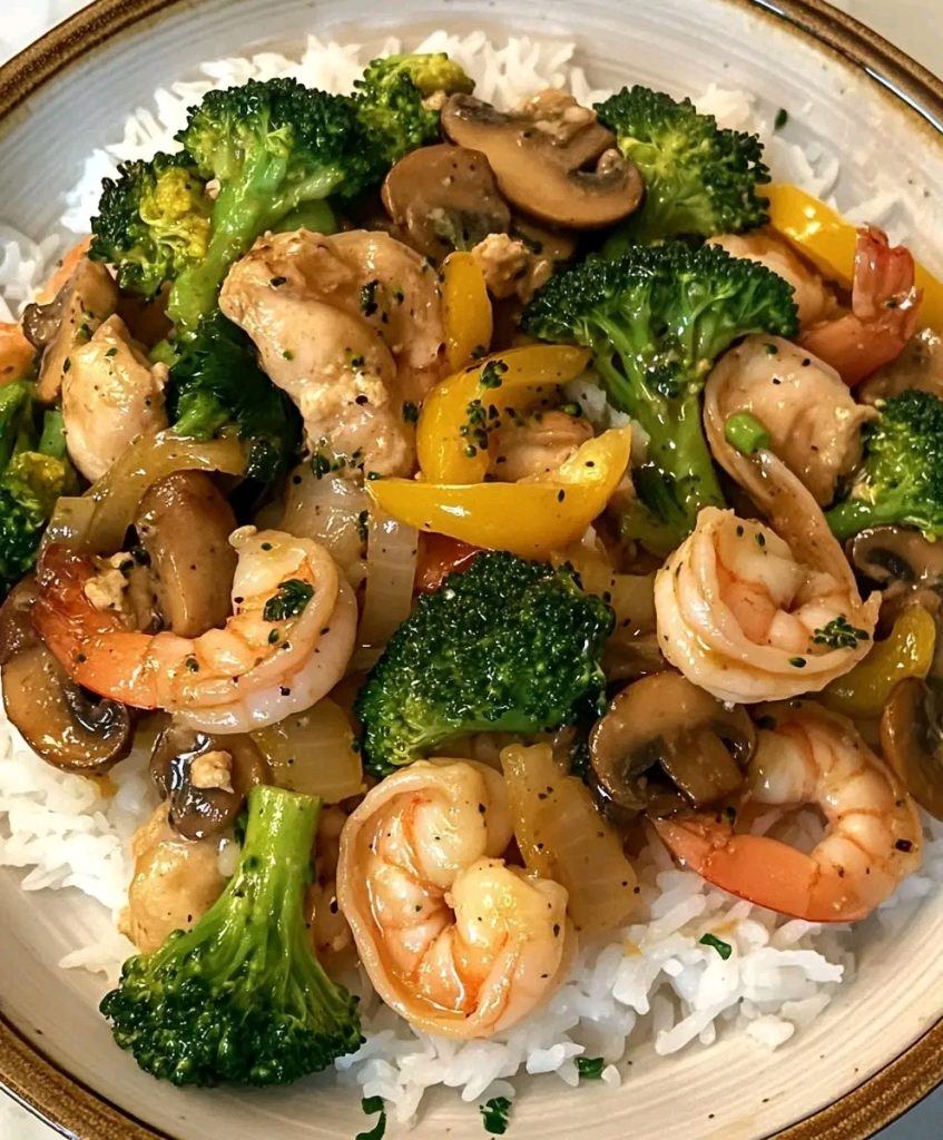 This bowl is a straight-up classic combo done rightβ€”tender chicken slices and juicy shrimp tossed with broccoli, mushrooms, and peppers over fluffy white rice. It’s savory, cozy, and packed with protein, perfect for a comforting homemade dinner that still feels fresh and balanced. Simple ingredients, big payoff.