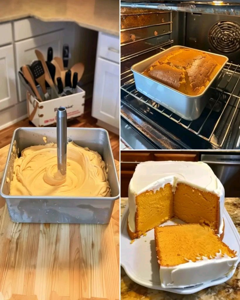 Prepare an Old Country Kitchenware square tube pan by placing a square of parchment paper between the two pieces. Brush generously with pan spray or baking spray.
