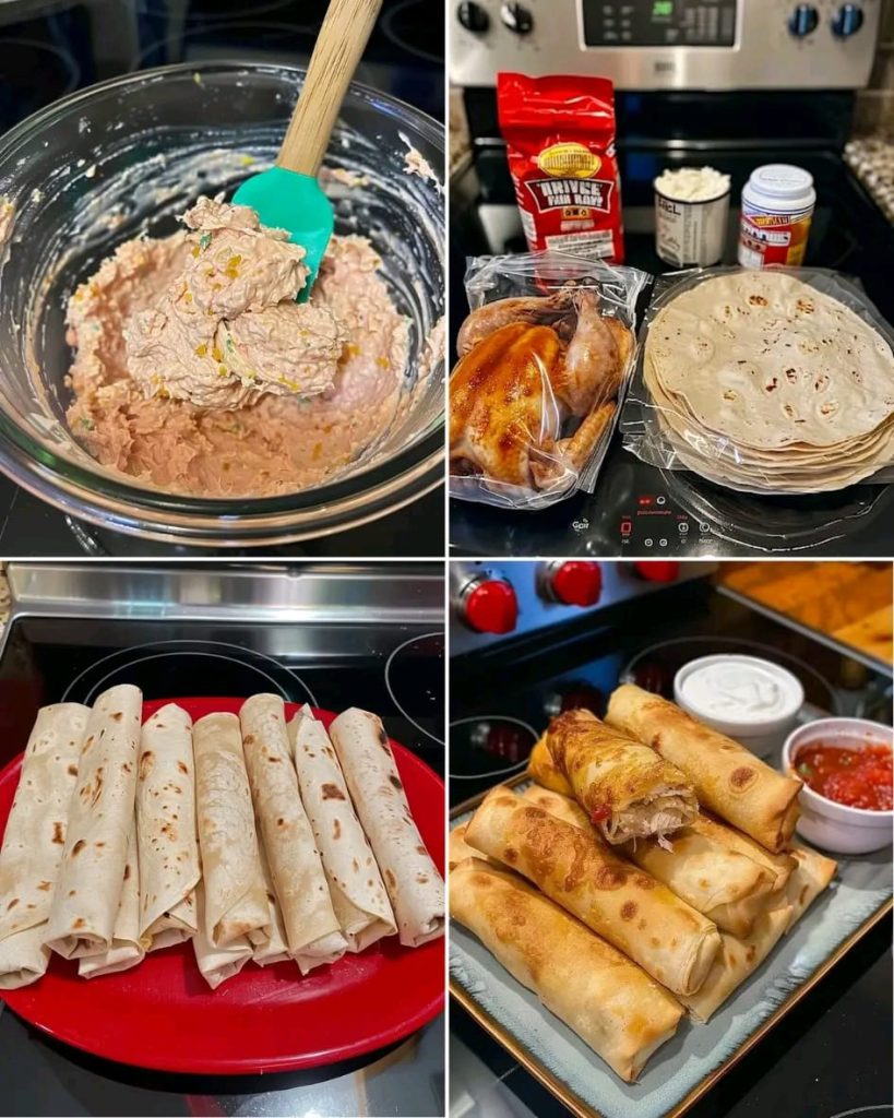 Spoon 2–3 tablespoons of the chicken mixture into the center of each tortilla and roll tightly.