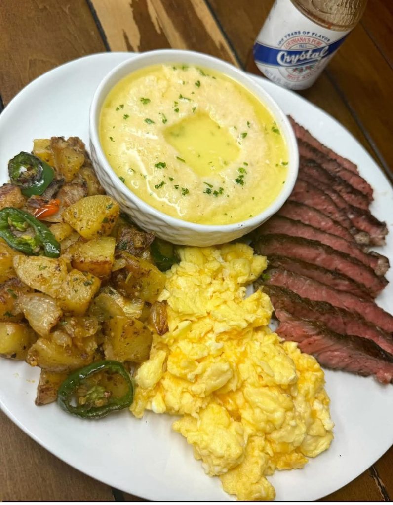 Steak, Crispy Potatoes, Creamy Grits & Cheesy Eggs