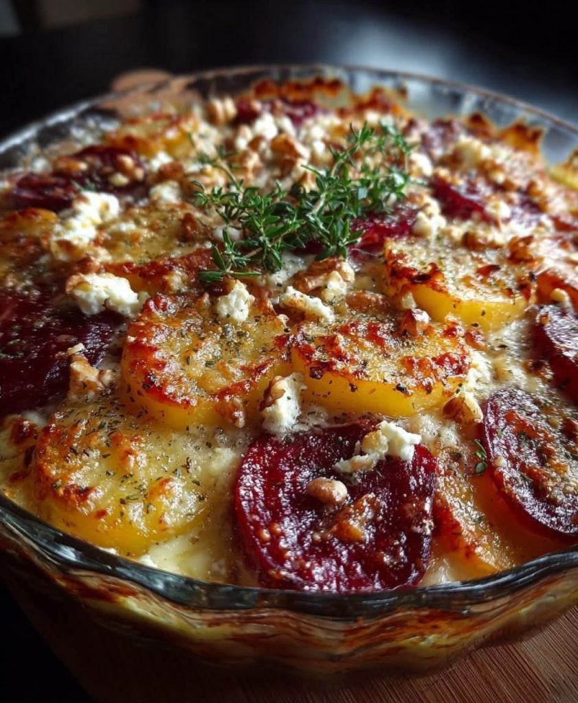 Layered Beet & Potato Gratin with Feta & Walnuts