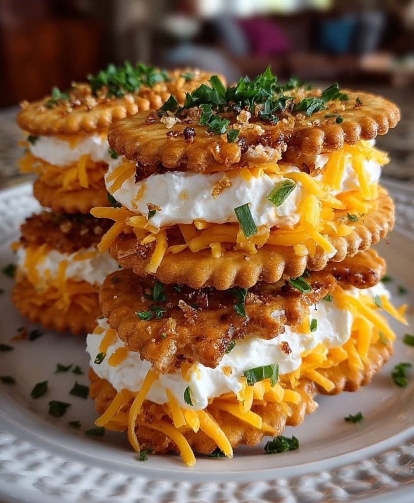 Spread about 1 teaspoon of filling onto one Ritz cracker and top with another cracker to form a sandwich.