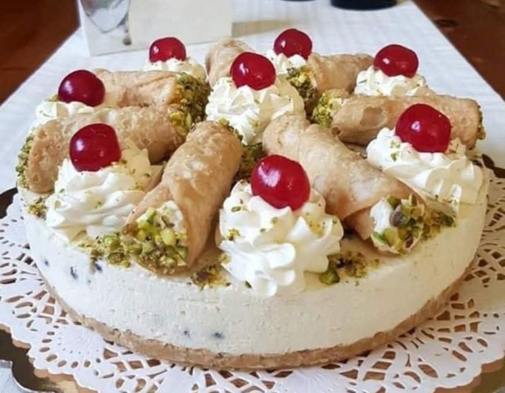 Decorate the cheesecake with piped whipped cream, mini cannoli, crushed pistachios, glazed cherries, and a sprinkle of dark chocolate. Slice and serve chilled with a cup of espresso or coffee .