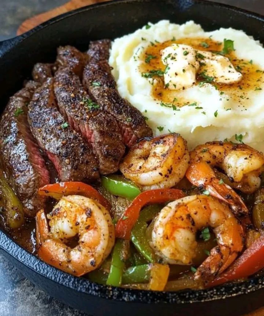 This sizzling cast iron combo is pure Southern soul — tender steak slices, juicy Cajun shrimp with peppers and onions, all cozied up next to creamy garlic mashed potatoes. It’s a skillet full of comfort and flavor!