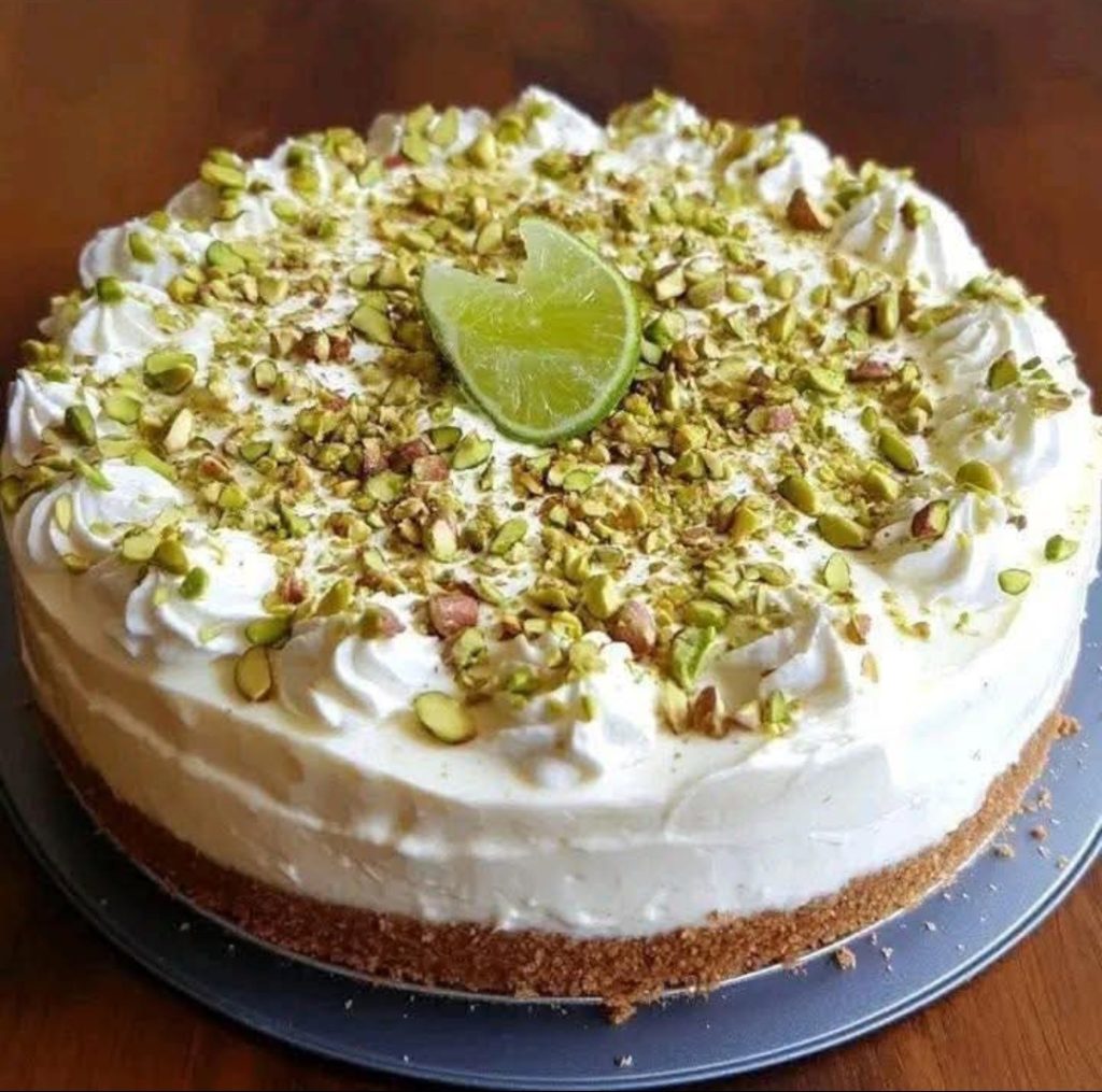 • Just before serving, sprinkle the lime zest and chopped pistachios over the top of the chilled cheesecake.