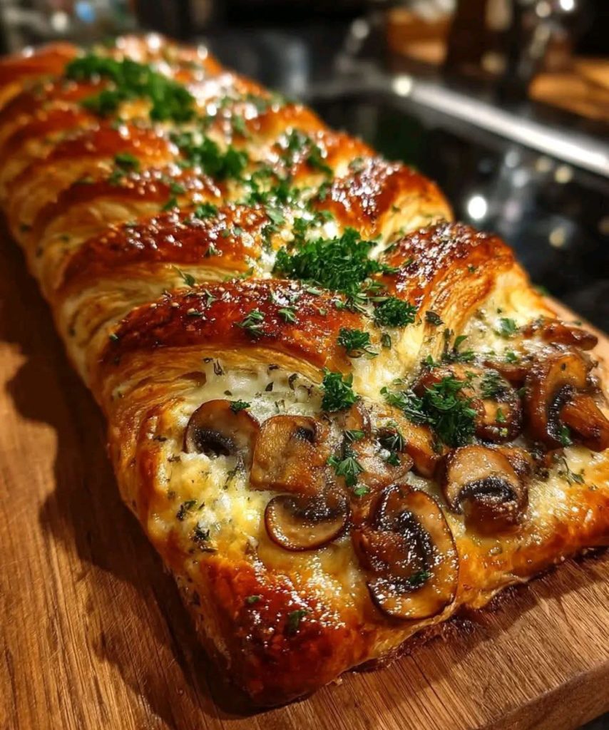Spread mushrooms and Gruyère down the center of pastry, cut sides into strips and braid over filling.