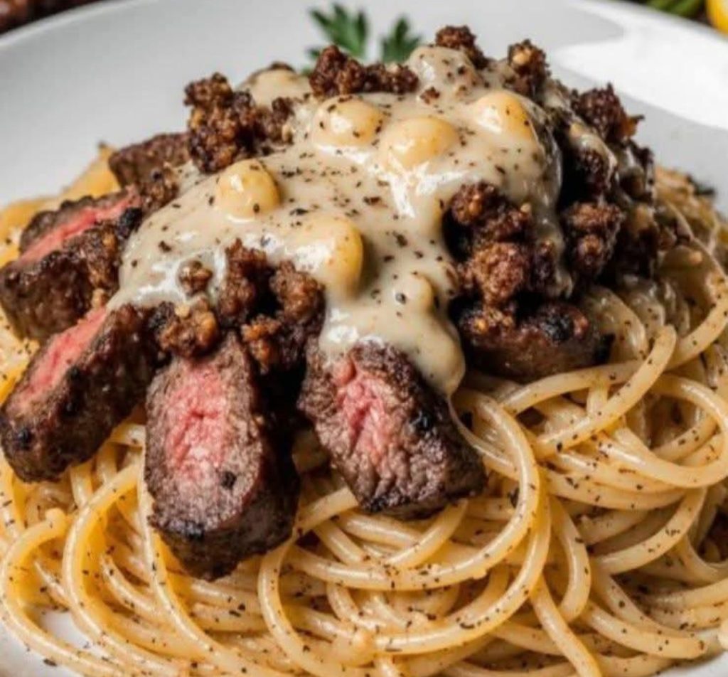 Rich, garlicky, buttery noodles tossed with juicy steak — fast, bold, and insanely satisfying