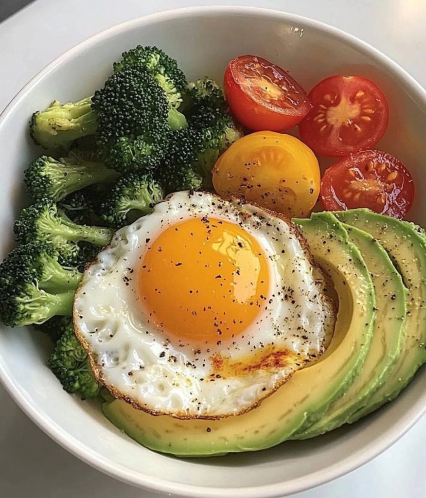 In a serving bowl, arrange the steamed broccoli, fried egg, avocado slices, and cherry tomato halves.