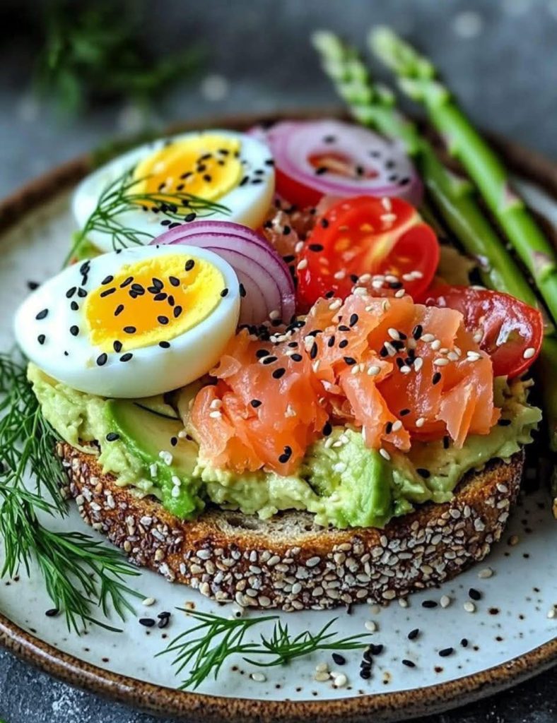 Top with asparagus, smoked salmon, and eggs. - Finish & serve
