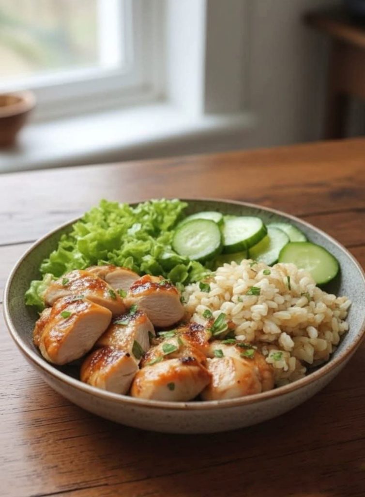 Spoon the herbed rice into serving bowls. Add lettuce and cucumber slices on the side. Slice the honey-glazed chicken and place it on top. - Finish & Serve