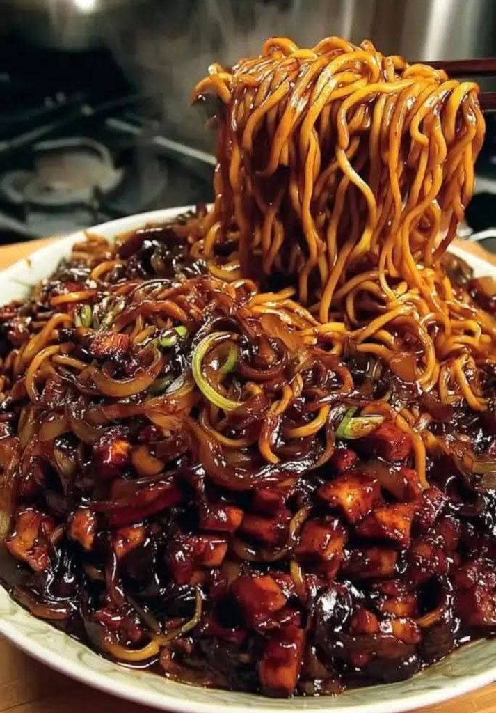 Jjajangmyeon is a classic Korean-Chinese noodle dish made with thick wheat noodles topped with a rich, savory black bean sauce. The sauce is prepared using chunjang (Korean black bean paste), pork, and vegetables such as onion, zucchini, and cabbage. It has a deep umami flavor with a slightly sweet finish and is one of the most popular comfort foods in Korea, often enjoyed on special occasions or as a hearty everyday meal.