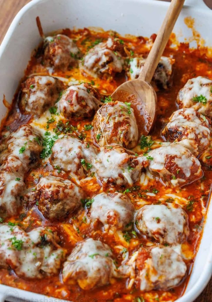 Serve this casserole hot with garlic bread, buttered pasta, or a fresh green salad. It’s also delicious tucked into toasted sub rolls for an easy meatball Parmesan sandwich.