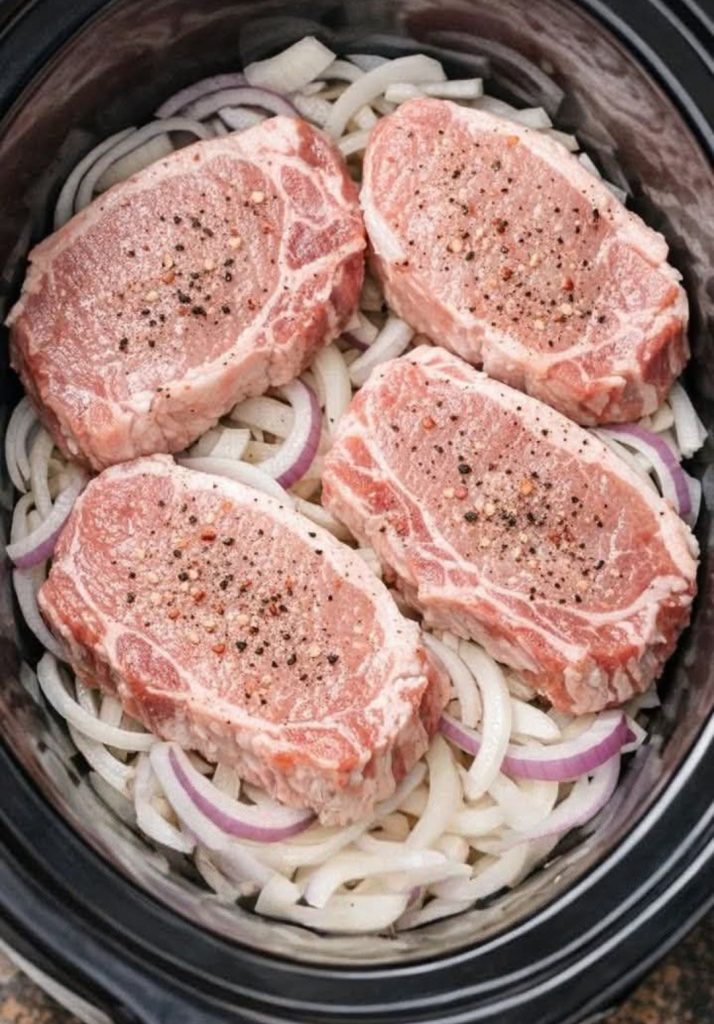 Place the raw pork chops in a single layer at the bottom of the slow cooker.