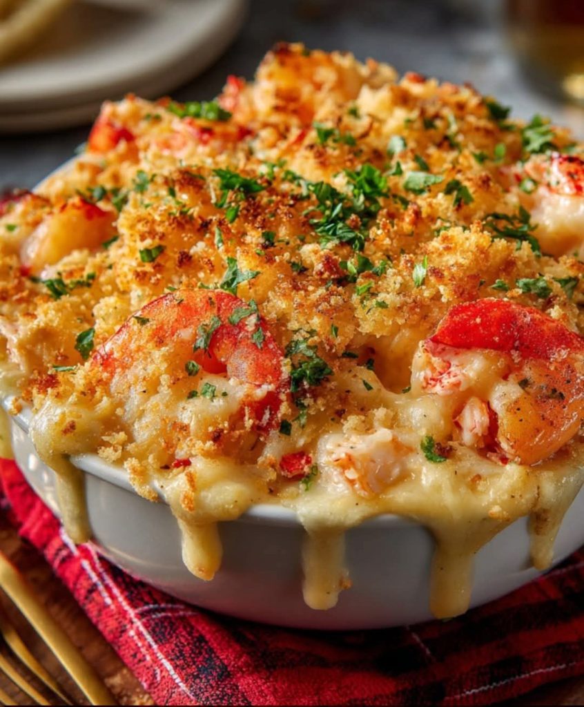 A rich, cozy seafood bake loaded with tender lobster and shrimp in a creamy cheese sauce, topped with a buttery golden Ritz cracker crust. Comfort food luxury—without the work.