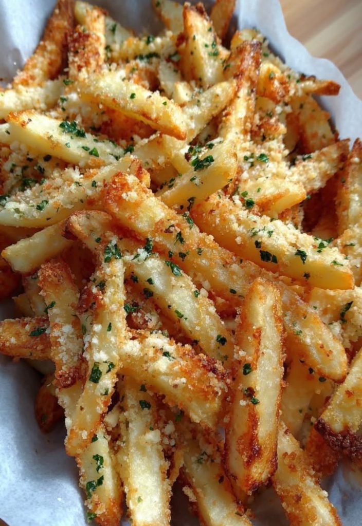 These baked garlic Parmesan fries are crispy on the outside, tender on the inside, and packed with bold, savory flavor. Roasted to golden perfection and tossed with fragrant garlic and salty Parmesan, they’re a lighter yet irresistible alternative to deep-fried fries—perfect as a snack, side dish, or party favorite.