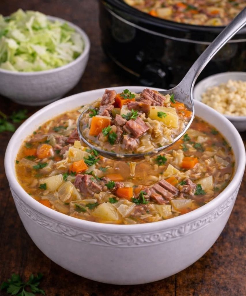 Slow Cooker Corned Beef & Cabbage Soup is a warm, comforting, and hearty dish inspired by the classic corned beef and cabbage dinner. Tender chunks of corned beef are slowly simmered with cabbage, potatoes, carrots, and onions in a flavorful broth. The long, slow cooking process allows all the ingredients to blend beautifully, creating a rich, savory soup that’s perfect for chilly days or a satisfying family meal. Easy to prepare and packed with flavor, this soup is ideal for busy days when you want a delicious, home-cooked meal with minimal effort.