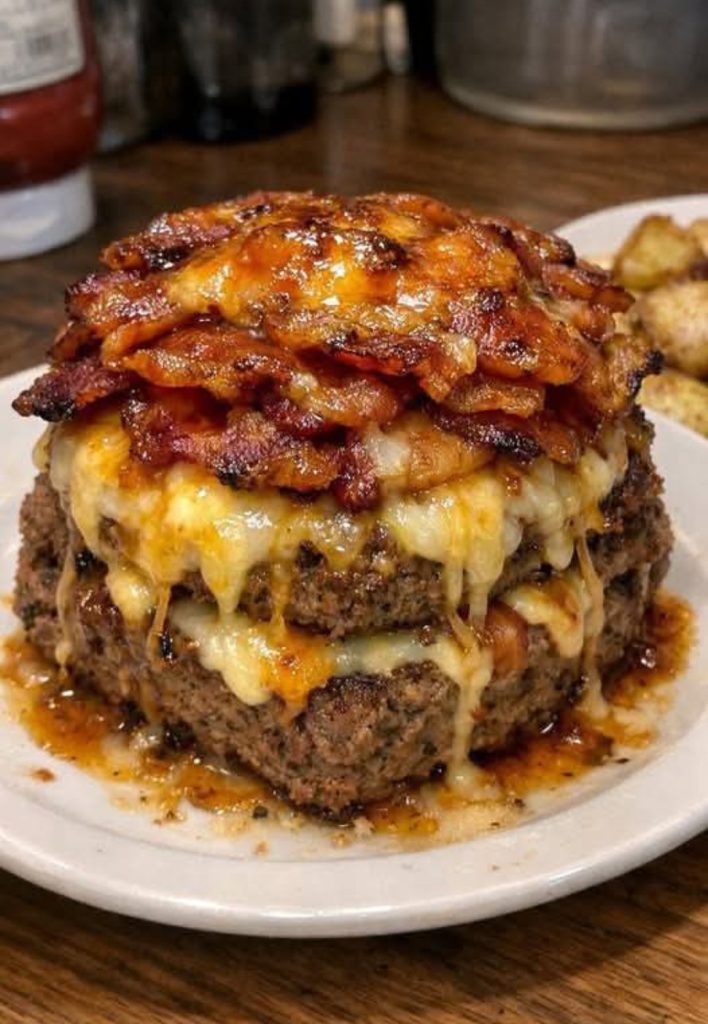 Serve the Bang-Bang Crispy Bacon Triple-Cheese Cheeseburger Meatloaf Stack