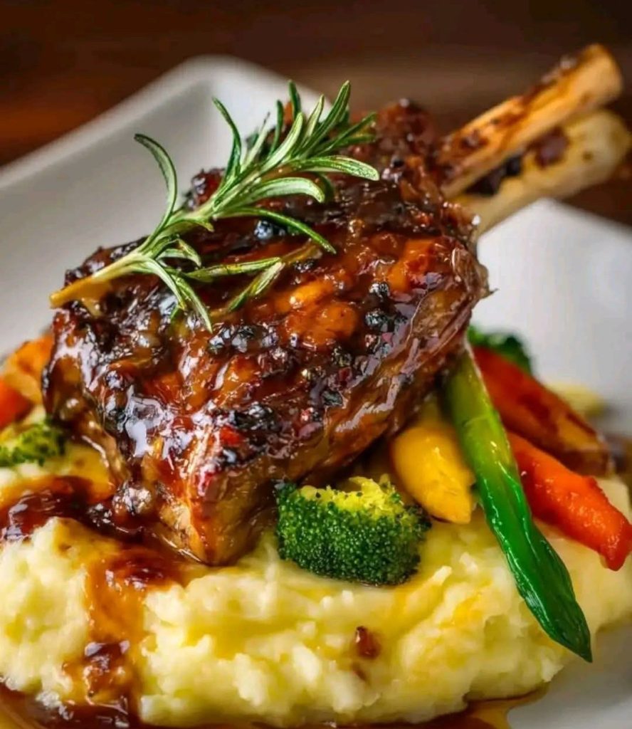 Spoon potatoes first, top with lamb shank, drizzle wine sauce, then add vegetables for a stunning plate.