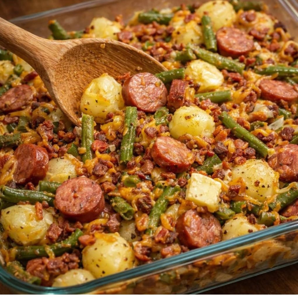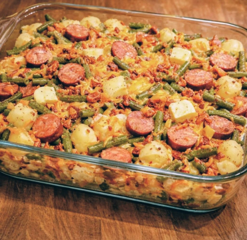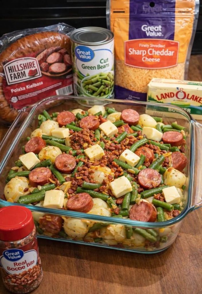 Add the sliced smoked sausage, potatoes, and green beans to the dish.