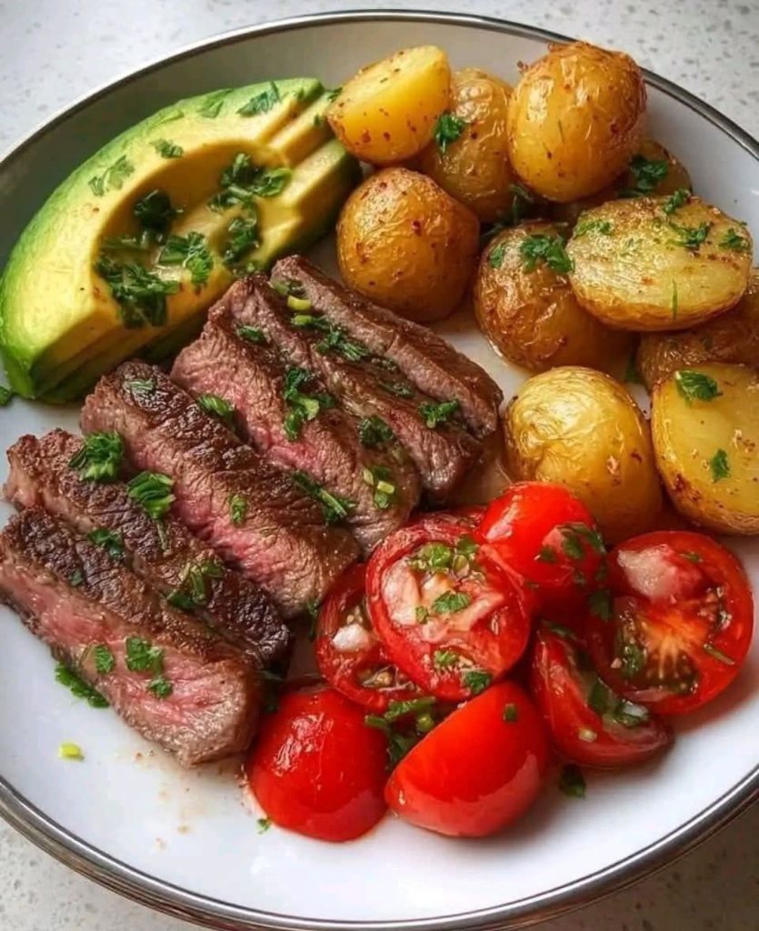 Arrange steak slices, roasted potatoes, avocado, and fresh tomatoes on a plate. Add parsley or green onion for that fresh finish with flair.