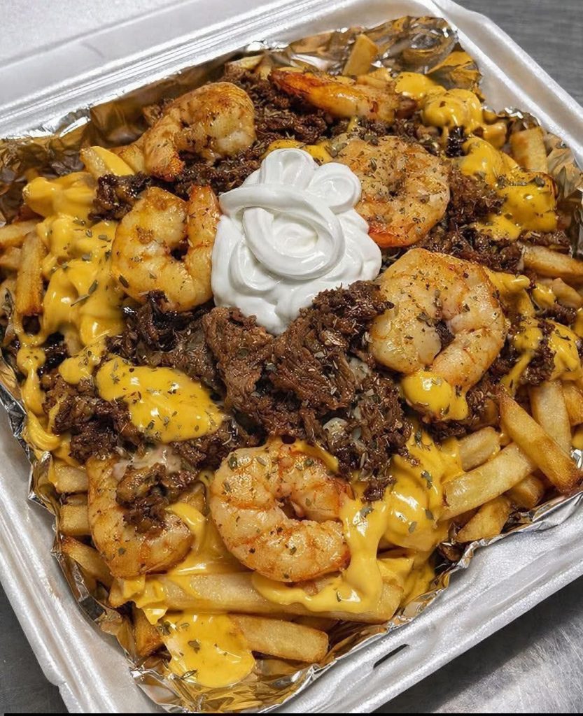 Crispy fries piled high with juicy steak, buttery shrimp, melty cheese, and a rich garlic sauce—pure indulgence in every bite!