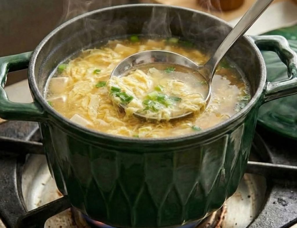 5️⃣ Let the eggs set for 10–15 seconds to form silky ribbons. Remove from heat and sprinkle with sliced spring onions.