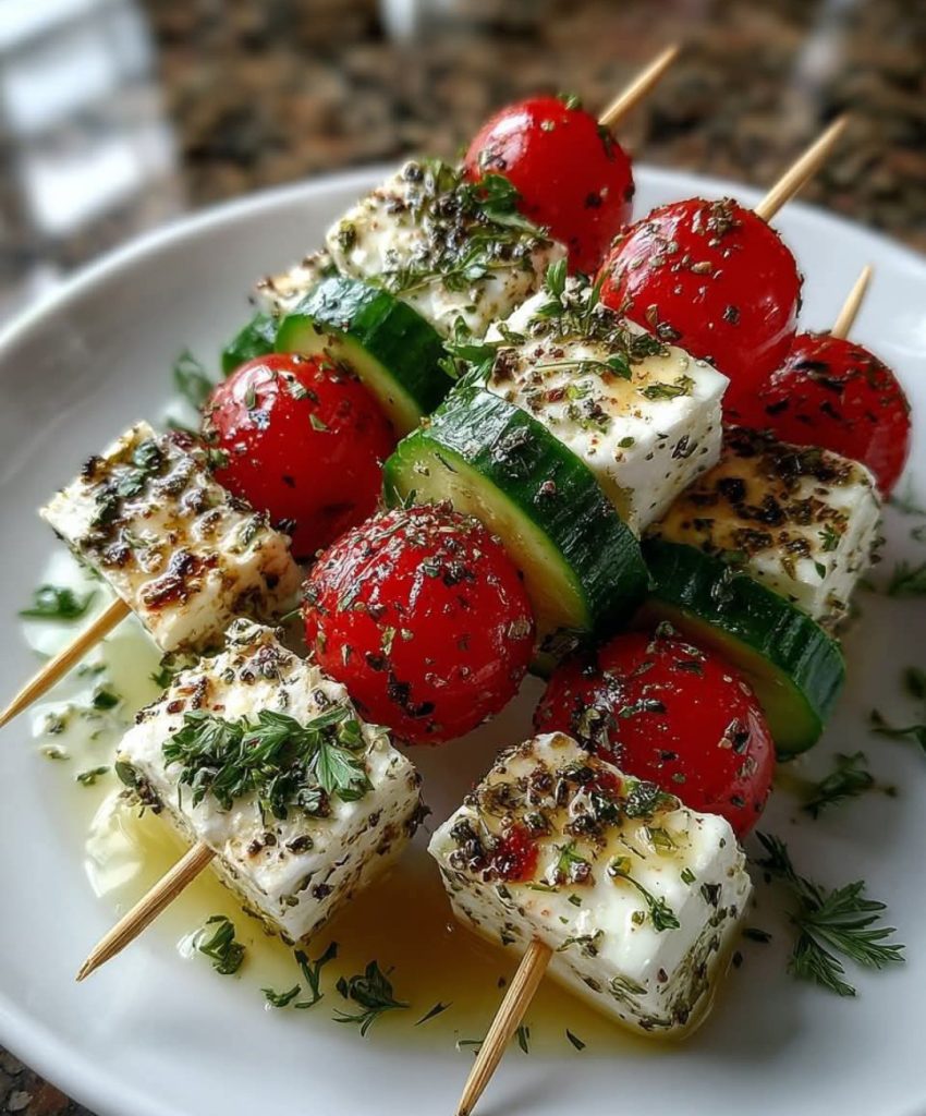 On each small skewer or toothpick, layer one cucumber slice, one feta cube, and one cherry tomato half.
