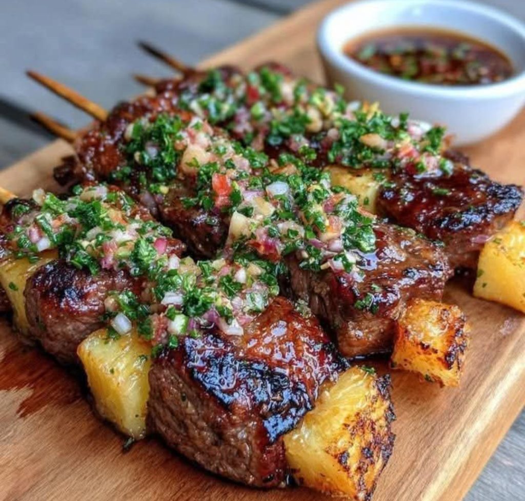 Preheat your grill to medium-high heat. Grill those delightful skewers for 2–3 minutes on each side until the beef reaches your desired doneness and the pineapple gets that lovely caramelization. Once done, remove them from the grill and let them rest for about 2 minutes. - Serve: