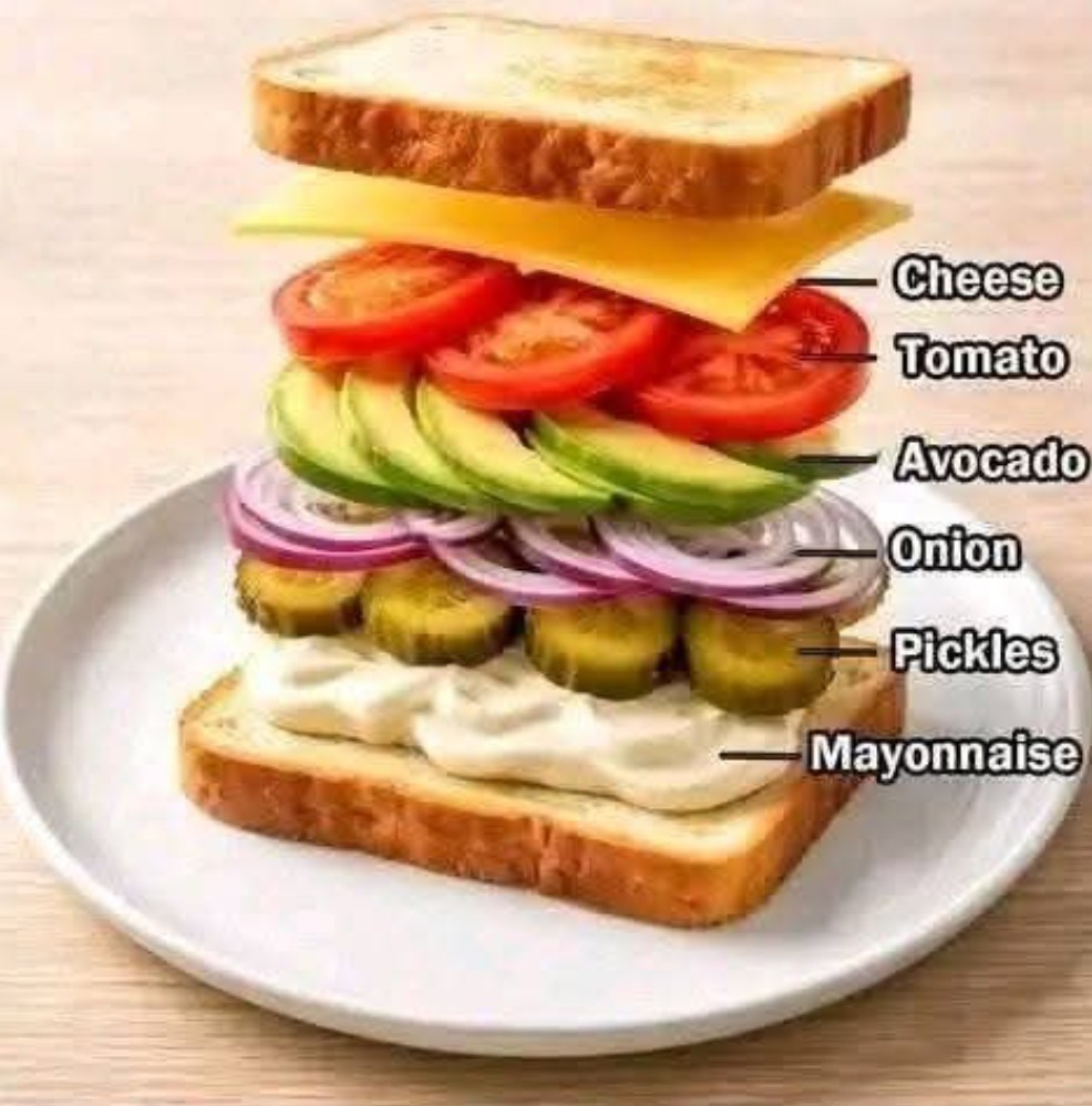 A colorful, flavor-packed sandwich loaded with creamy avocado, juicy tomatoes, crunchy pickles, sharp red onions, melty cheese, and smooth mayonnaise — all layered between perfectly toasted slices of bread. Every bite is creamy, tangy, fresh, and satisfying. Simple ingredients, BIG flavor!