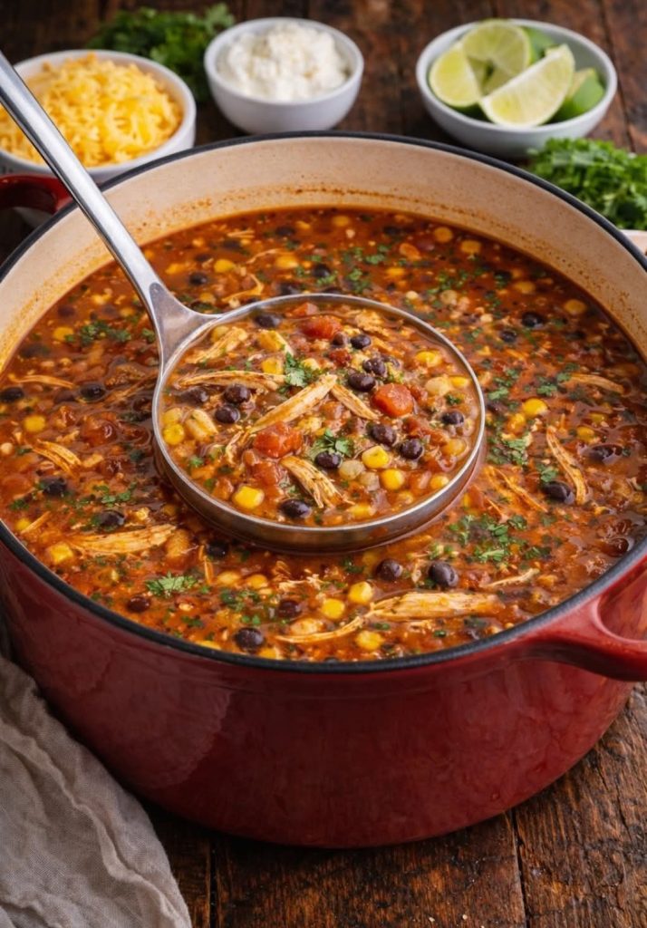 Chicken Taco Soup is a comforting, flavor-packed dish loaded with tender shredded chicken, black beans, sweet corn, tomatoes, and warm taco spices. It’s a one-pot meal that’s easy to make, filling, and perfect for busy weeknights. Serve it with shredded cheese, sour cream, and fresh lime for the ultimate bowl of deliciousness.