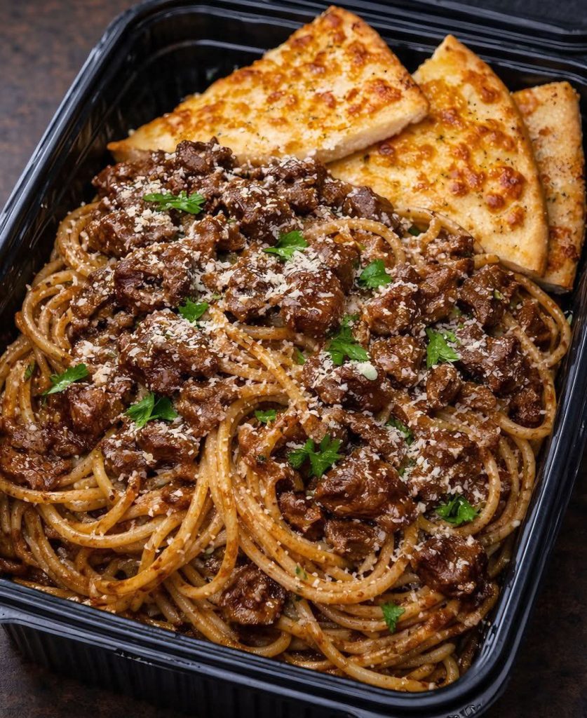 This Savory Beef Pasta is a hearty, comforting dish loaded with rich ground beef, perfectly cooked pasta, and a flavorful tomato-based sauce infused with garlic and herbs. What makes it extra special? Crispy, buttery garlic bread slices placed right on top, adding a golden crunch to every bite. It’s the perfect family dinner that’s simple, satisfying, and full of bold flavors.