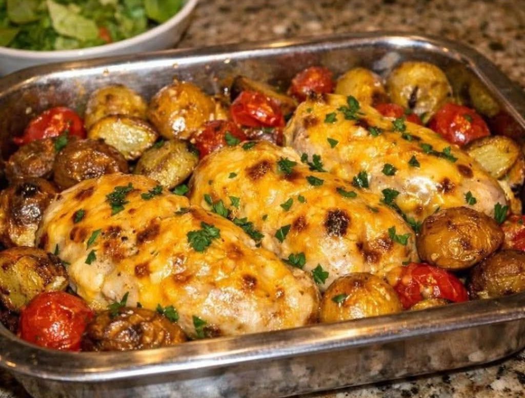 Bake in the preheated oven for 30–35 minutes, or until the chicken is fully cooked (internal temperature reaches 165°F / 74°C) and the potatoes are fork-tender.