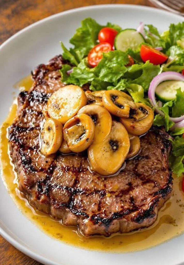 A perfectly cooked ribeye steak crowned with buttery sautéed mushrooms creates an irresistible steakhouse-quality meal right at home. With its rich marbling, the ribeye stays tender and juicy, while the golden mushrooms add earthy depth and a glossy finish. The key to achieving that restaurant-style crust is simple: bring the steak to room temperature, pat it completely dry, and cook it in a very hot pan without moving it too soon. This allows a deep, flavorful sear to develop while keeping the inside perfectly tender and juicy.