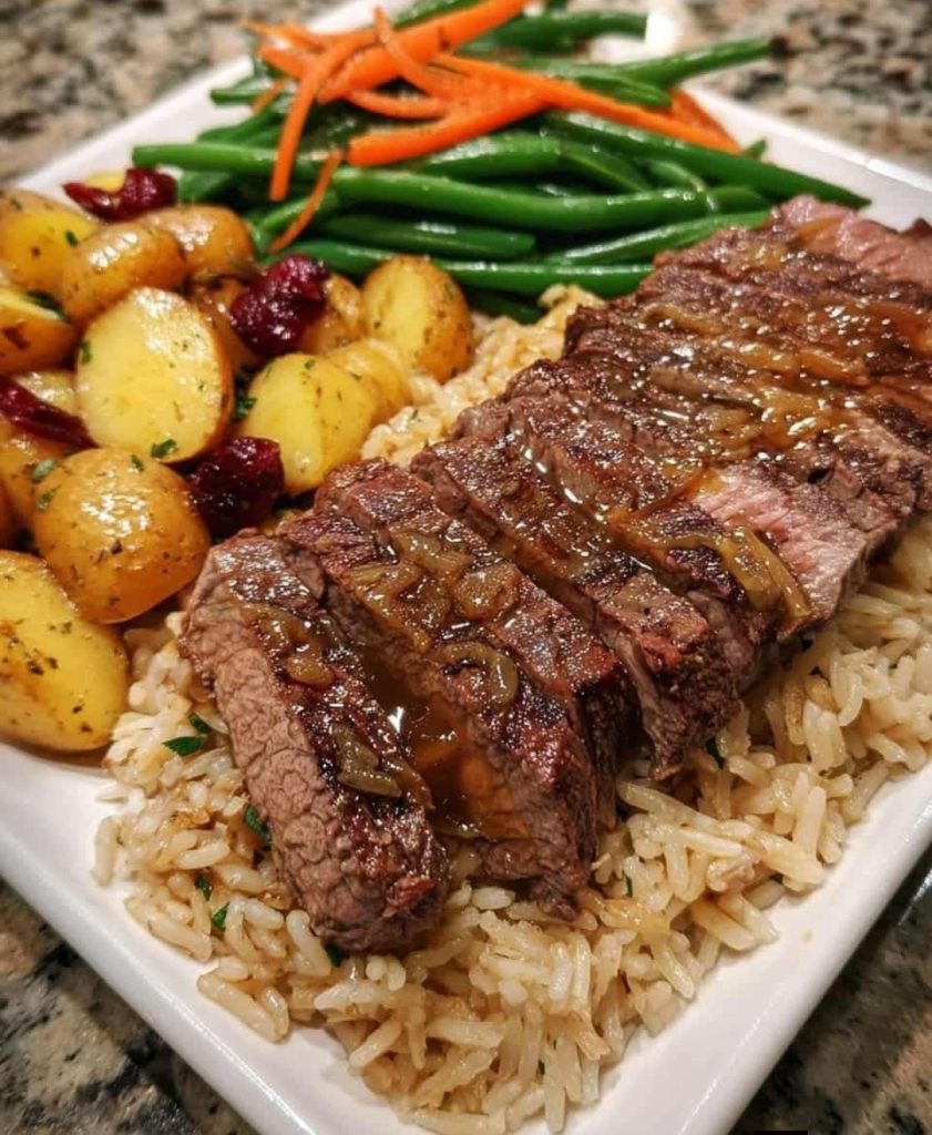 Fluff warm rice onto plates, slice steak against the grain, and drizzle extra garlic butter over everything. Plate with potatoes and veggies for a stunning family dinner favorite and a guaranteed crowd-pleasing meal.